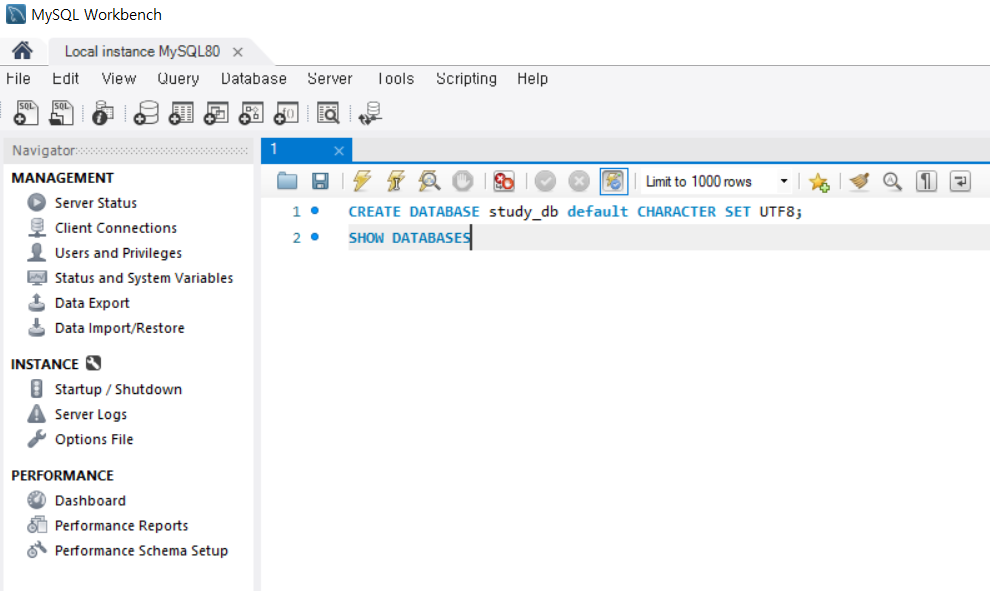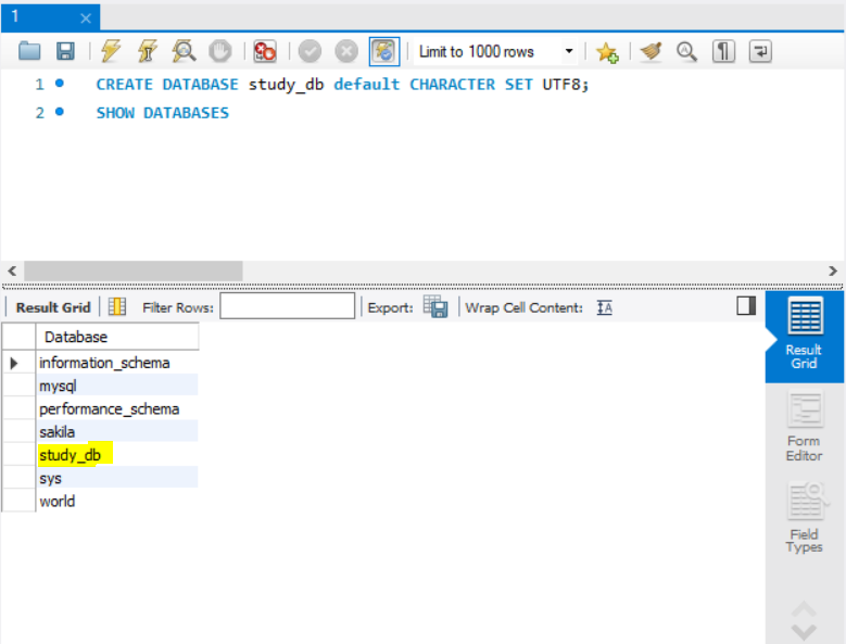 방금 만든 'study_db'가 출력된 것을 확인할 수 있다. 우리가 만들지 않은 데이터베이스도 여러 개가 출력되긴 하지만 신경쓰지 않아도 된다.