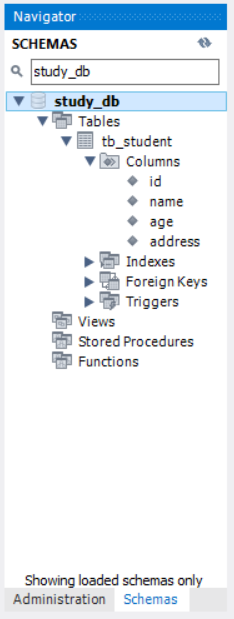 MySQL Workbench 좌측에서 Schemas 탭을 선택하고 study_db를 더블클릭한다. (안 보이면 검색하기)
