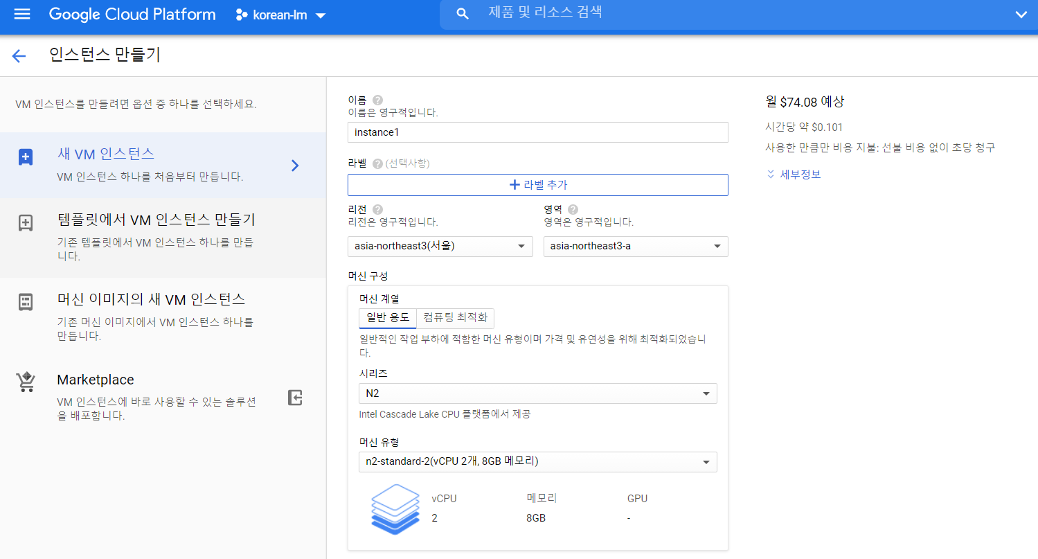 인스턴스 이름을 원하는대로 입력하고, 리전은 나의 경우 가까운 서버를 이용하기 위해 asia-northeast3(서울)을 선택했다.