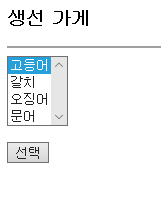 고등어에 selected를 써주었기 때문에 아무것도 누르지 않았을 때 고등어가 선택 되어있다.