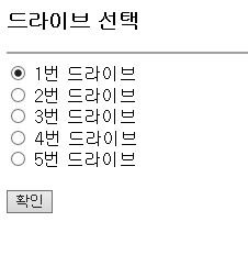 <input type=radio name=drive value=1번 checked> 1번 드라이브 <br>