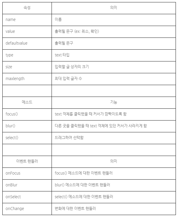 속성, 메소드는 Text 객체와 거의 동일하나 이벤트핸들러에는 추가적으로 onKeyDown, onKeyPress, onKeyUp이 있다.