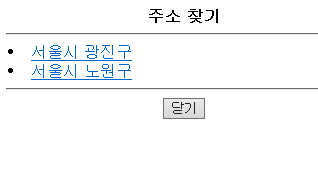 주소찾기 버튼을 누르면 새 팝업창에 주소 목록이 뜨고, 그 중 하나를 클릭하면 해당 주소가 입력되도록 만들기