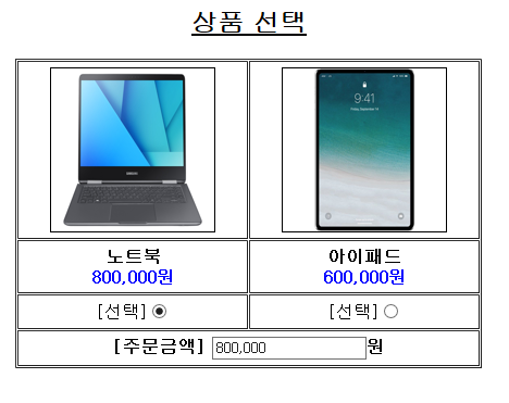 판매 상품의 사진과 가격을 표시하고, 선택한 상품의 금액을 출력하기